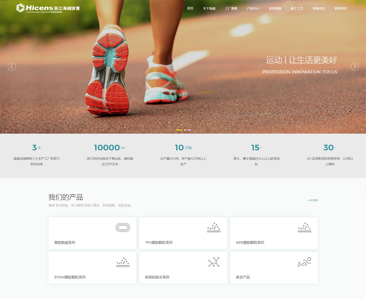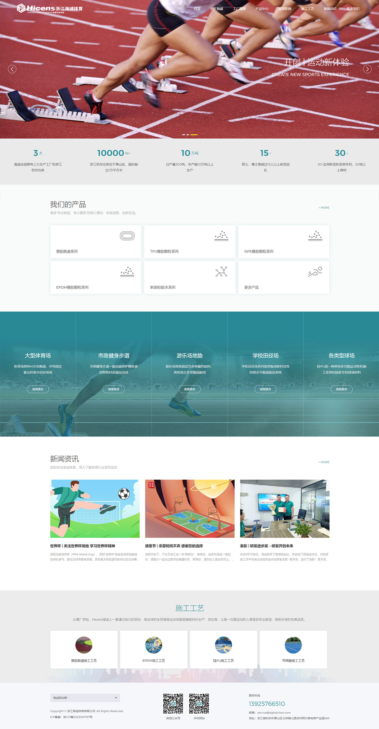 Hicens海誠,是一家集研發、生產、銷售、工程、售后服務為一體的彈性運動地面、休閑綠道場地材料智造商,現有廠房面積上2萬平方米,通過ISO9001質量管理體系、ISO14001環境管理體系、ISO45001職業健康安全管理體系認證,日產量300噸,年產能10萬噸。
