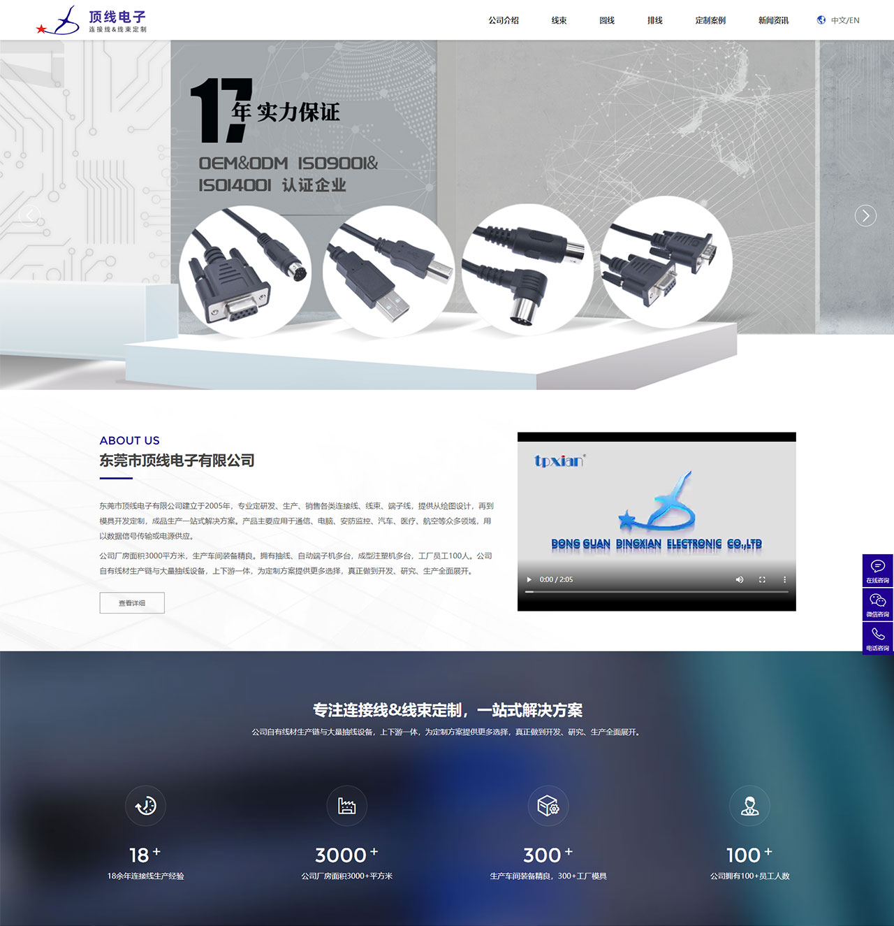 東莞市頂線電子有限公司建立于2005年,專業定制研發、生產、銷售各類連接線、線束、端子線,提供從繪圖設計,再到模具開發定制,成品生產一站式解決方案。產品主要應用于通信、電腦、安防監控、汽車、醫療、航空等眾多領域,用以數據信號傳輸或電源供應。